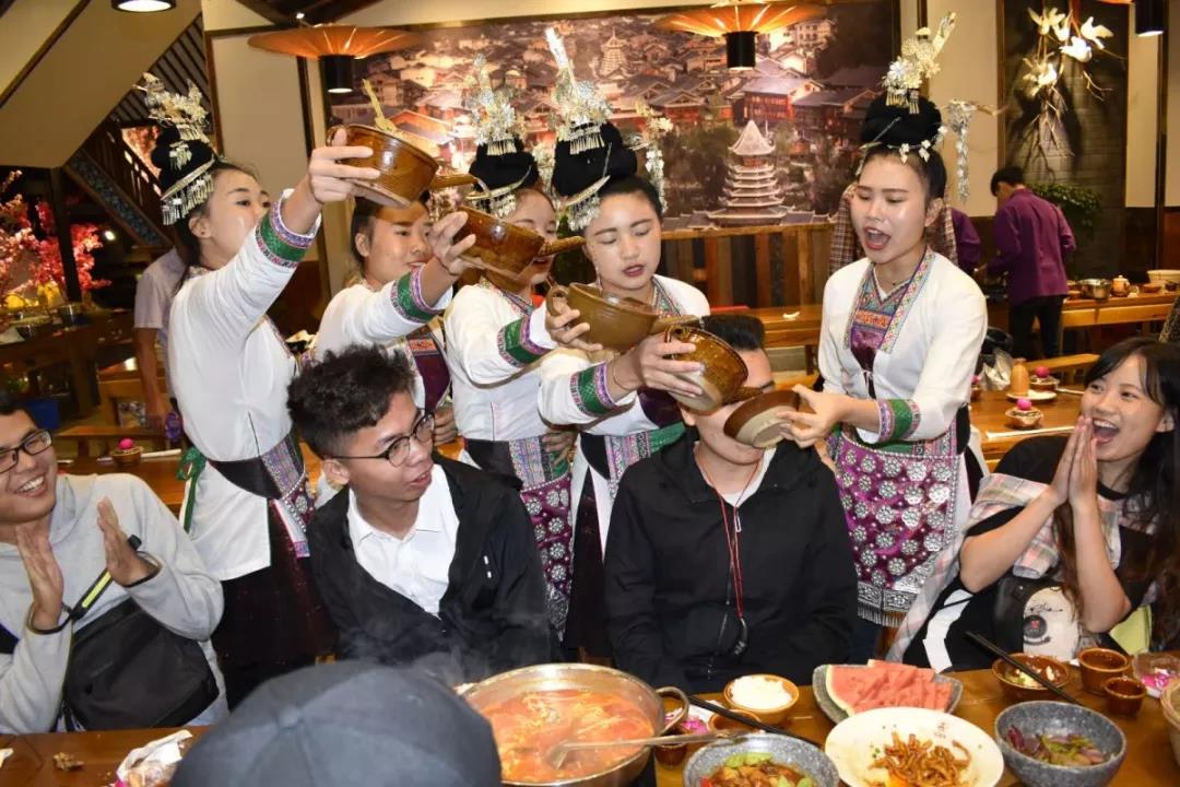 欣賞完千戶苗寨的美景,中午將至,前往品嘗苗族特色菜—長桌宴(長桌宴是西江苗寨獨特的一種待客習俗,用餐時是所有人都坐在一張大長桌上,主人會唱敬酒歌不停地敬酒,直到客人喝醉或已經滿意為止,讓我們充分感受到苗家人的熱情好客和苗鄉豐富多彩的飲食文化)。