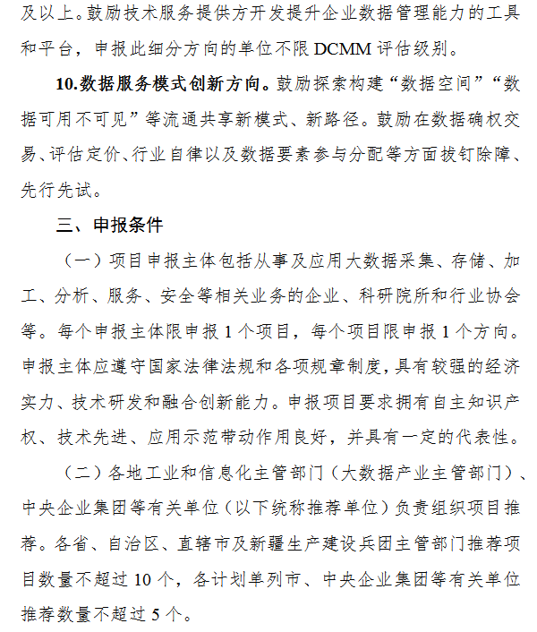 本次申報(bào)圍繞工業(yè)大數(shù)據(jù)應(yīng)用、行業(yè)大數(shù)據(jù)應(yīng)用、大數(shù)據(jù)重點(diǎn)產(chǎn)品、數(shù)據(jù)管理及服務(wù)四個(gè)方向,征集并遴選一批大數(shù)據(jù)產(chǎn)業(yè)試點(diǎn)示范項(xiàng)目,通過(guò)試點(diǎn)先行、示范引領(lǐng),總結(jié)推廣可復(fù)制的經(jīng)驗(yàn)做法,推進(jìn)大數(shù)據(jù)產(chǎn)業(yè)高質(zhì)量發(fā)展。申報(bào)指南詳見(jiàn)附件。